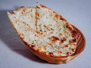Leavened, Tandoor baked flatbread with chopped garlic and black sesame seeds.