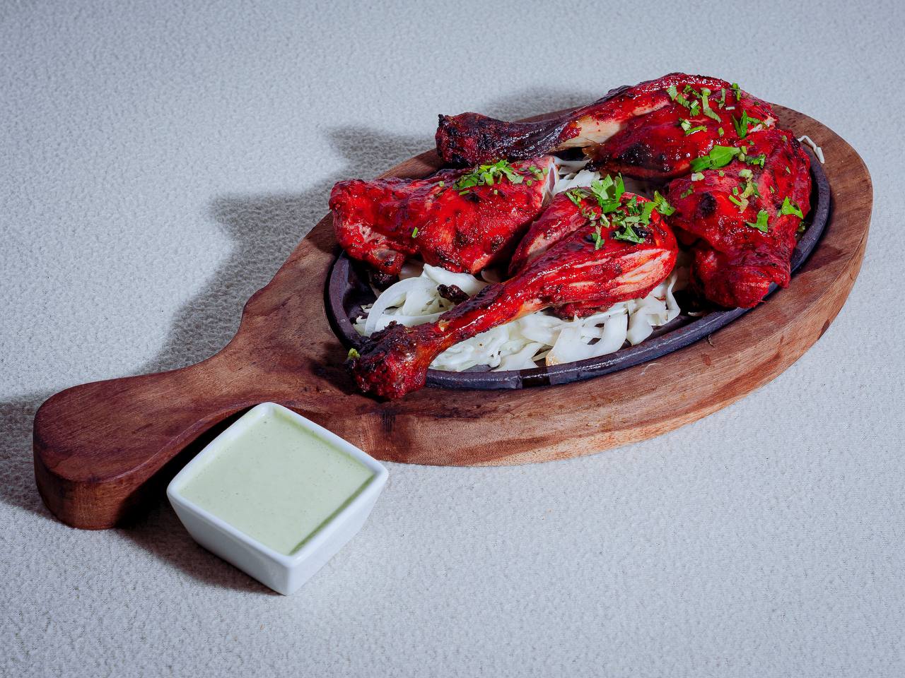 Two pieces of chicken legs and thigh, Marinated in yogurt, ginger garlic paste, spices, then Barbequed in Tandoor served with salad and mint sauce. (Oven).